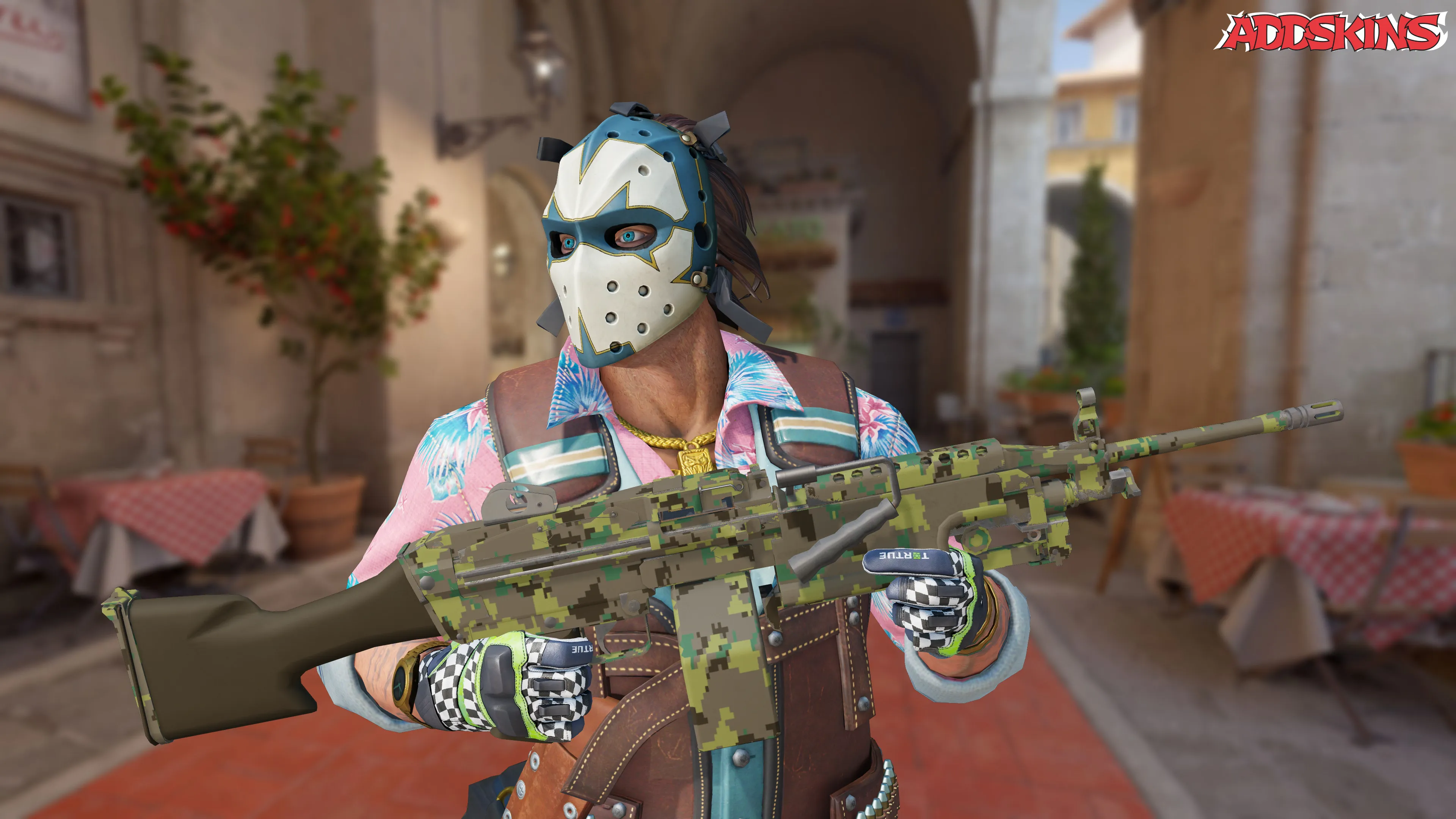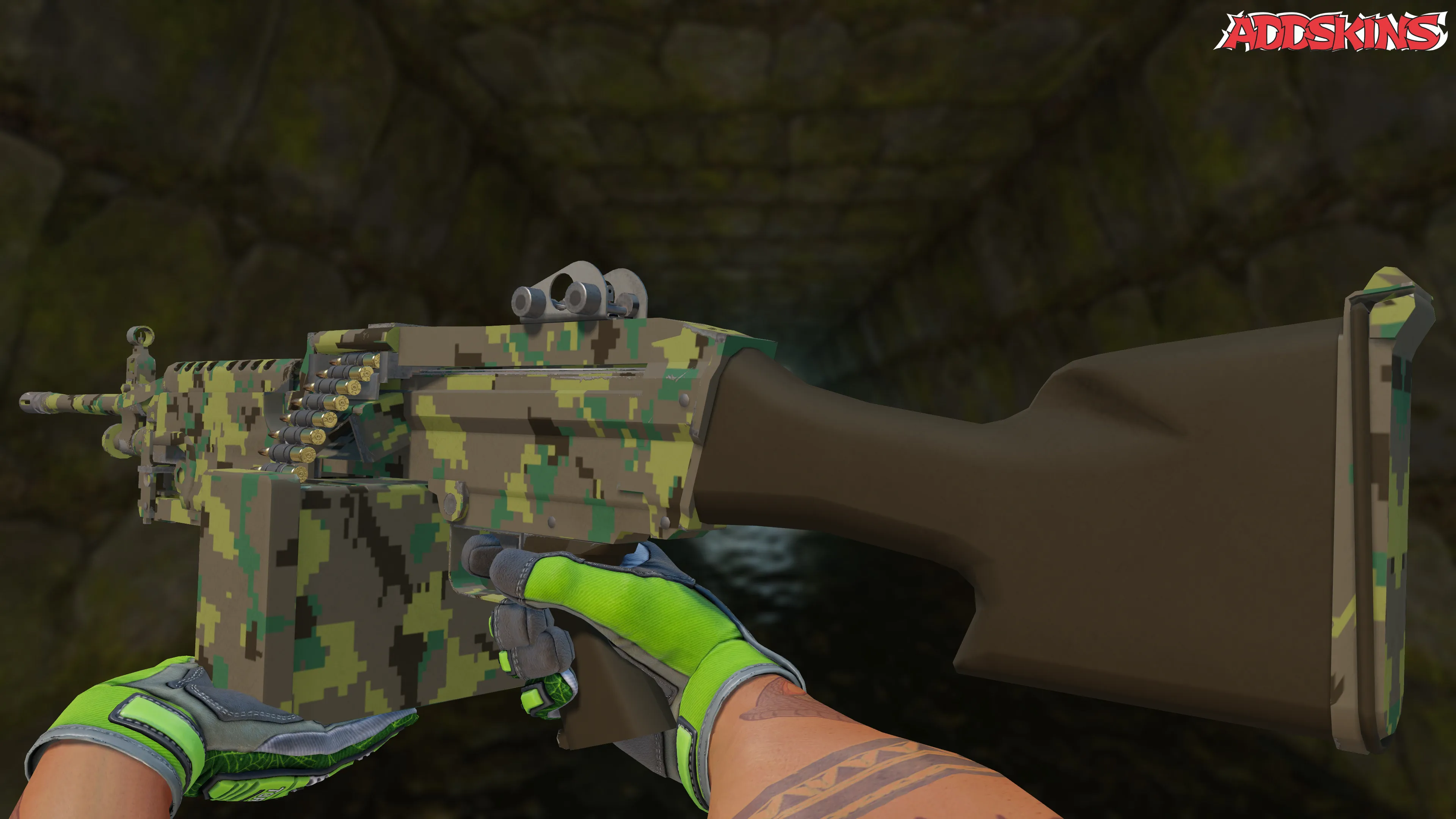 Этот M249 с изношенным состоянием украшен отделкой Jungle DDPAT, нанесенной методом гидрографики. Части оружия погружаются в водный резервуар, где на поверхности плавает пленка с джунглями, придавая ему в основном зеленоватый оттенок. Интенсивность и расположение узора могут варьироваться в зависимости от индекса узора.