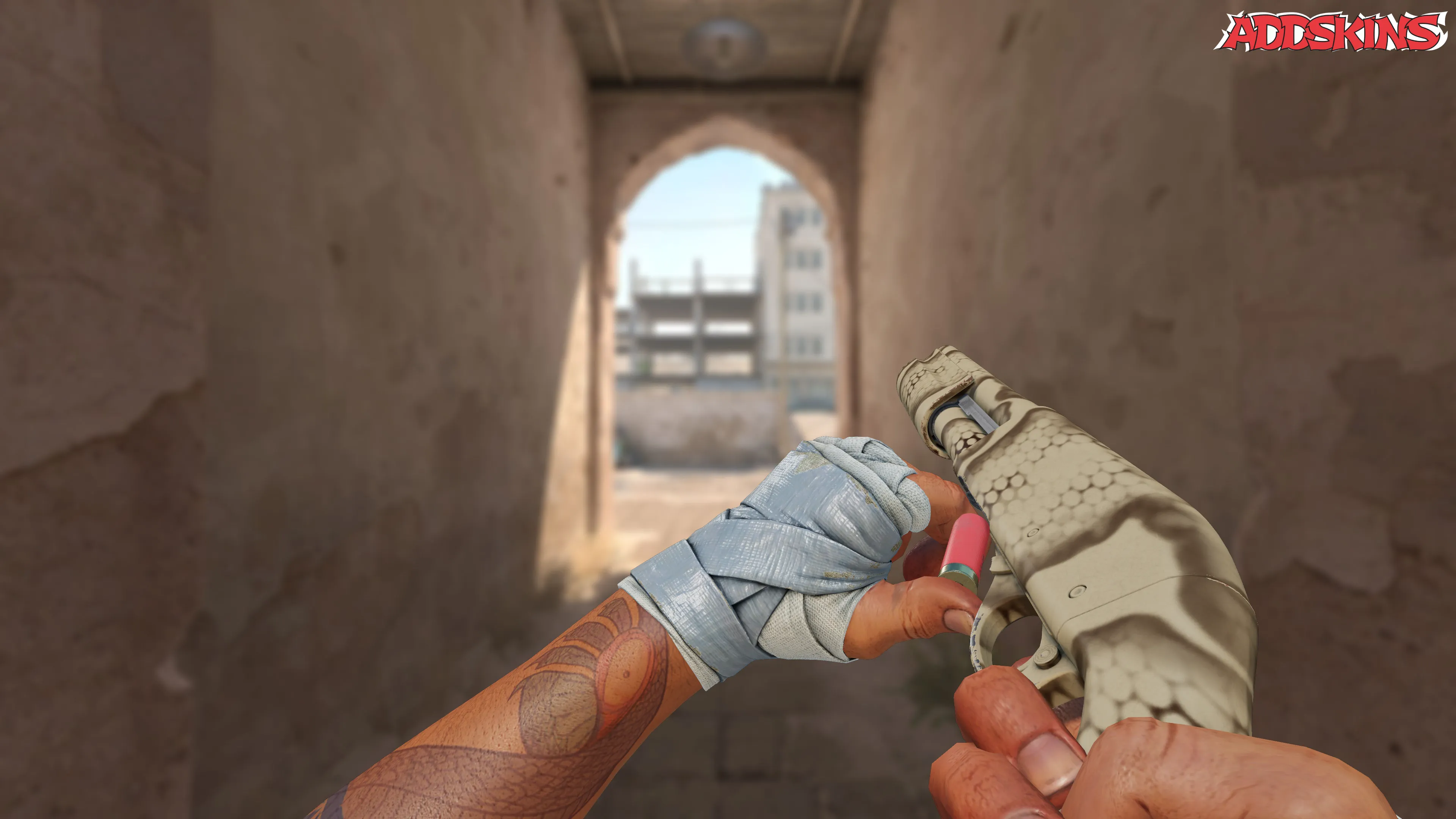 Этот Sawed-Off имеет отделку Snake Camo, выполненную в стиле распыления краски. На скине присутствуют несколько слоев краски различных оттенков серого, а индекс узора Snake Camo определяет общий вид скина.