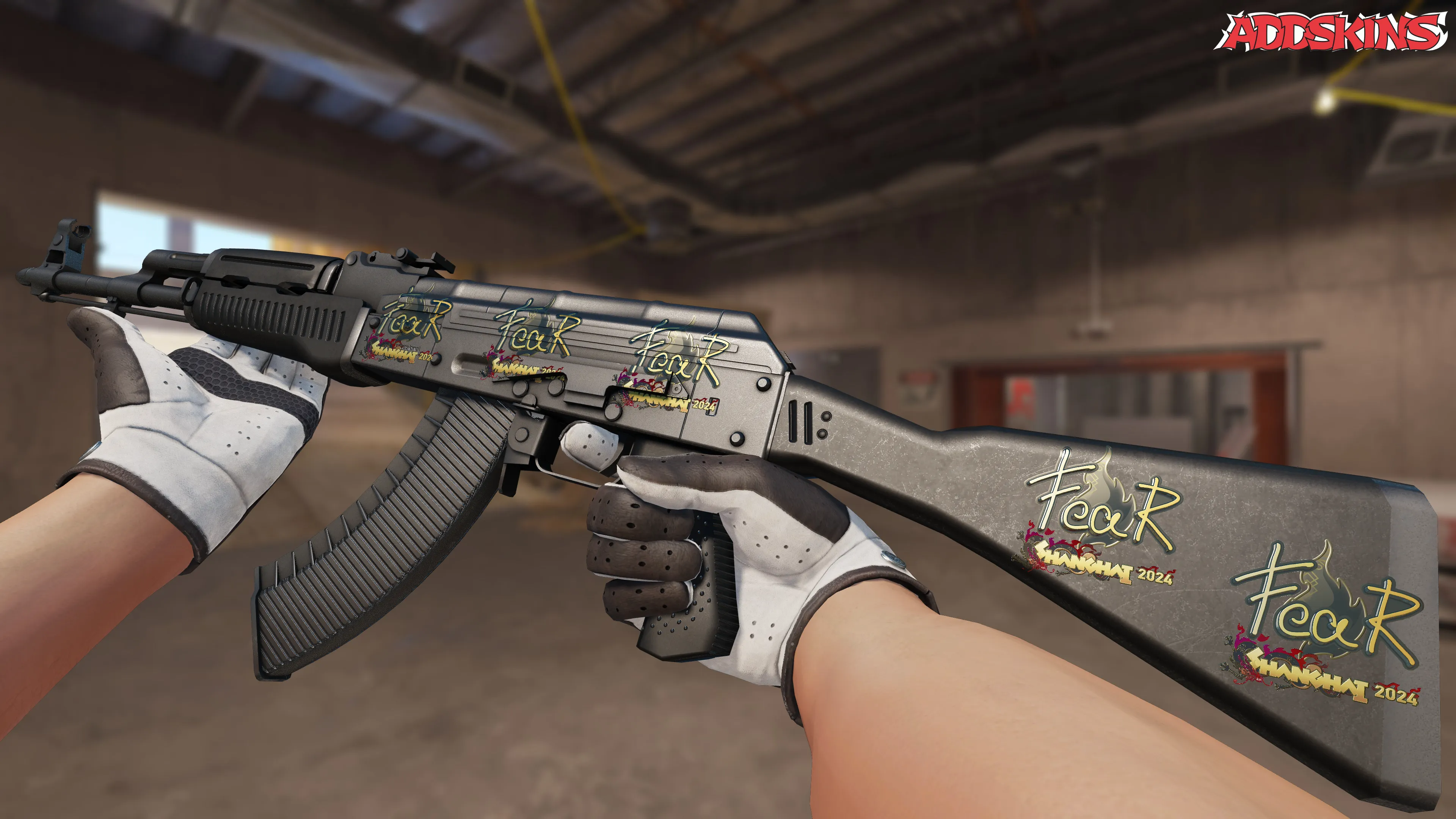 Скин представляет собой золотистый стикер с изображением символа страха на фоне города Шанхай 2024 года, что придает оружию элегантный и агрессивный вид. Детали и оттенки выполнены с высокой степенью проработки, что делает скин привлекательным для коллекционеров и ценителей красивого оружия в CS2.