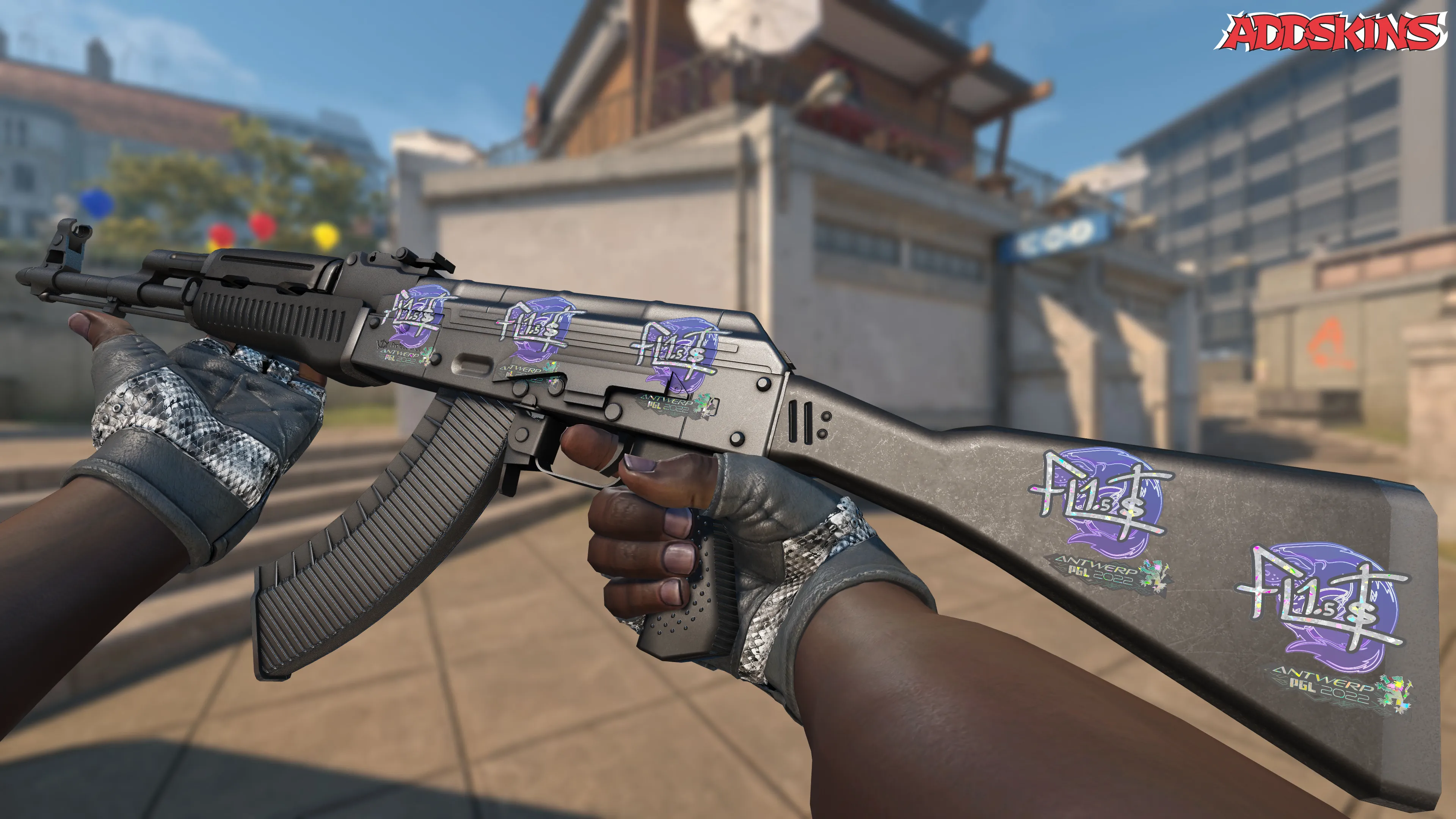 Скин с изображением FL1T на фоне города Антверпен выглядит стильно и элегантно, привлекая внимание качественным дизайном и яркими цветами. Блестящие элементы добавляют особую привлекательность и делают скин еще более привлекательным для коллекционеров и ценителей красивых вещей.