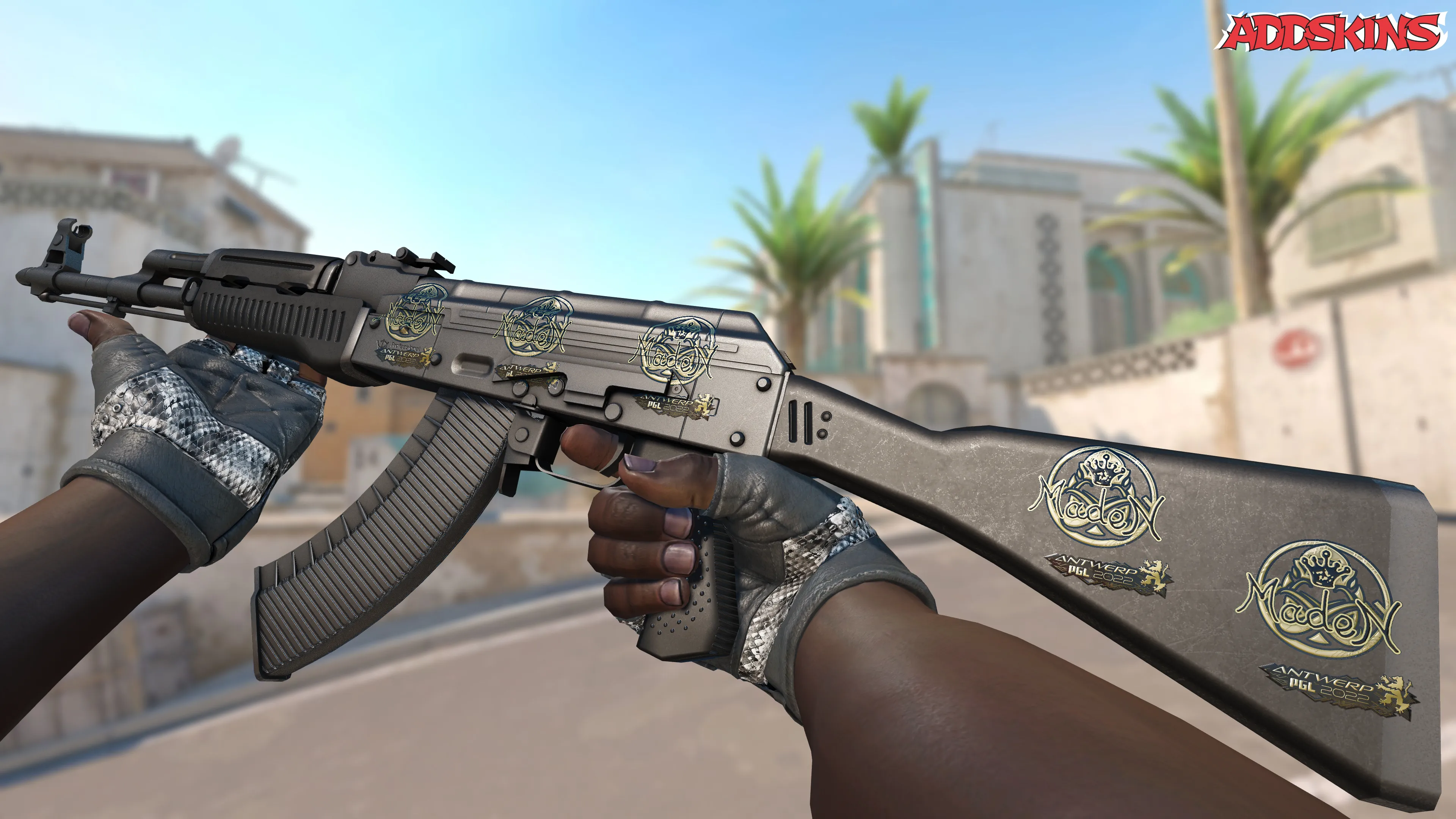 Скин в золотистых тонах с изображением мадены и символикой Antwerp 2022, подчеркивающий стиль и профессионализм игрока. Уникальный дизайн и качественная отделка делают этот скин желанным аксессуаром для любого ценителя CS2.