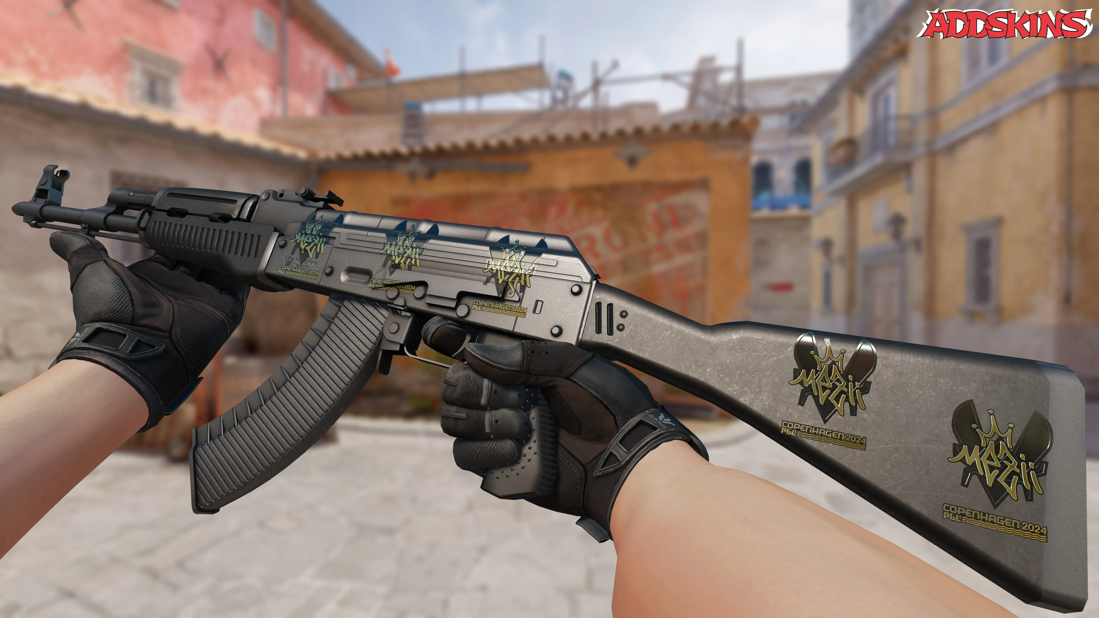 Скин в золотистом оттенке с изображением символов Копенгагена 2024, подчеркивающий стиль и решительность игрока. Этот скин отличается высоким качеством деталей и привлекает внимание своей уникальной графикой, добавляя игроку уверенности на поле боя.