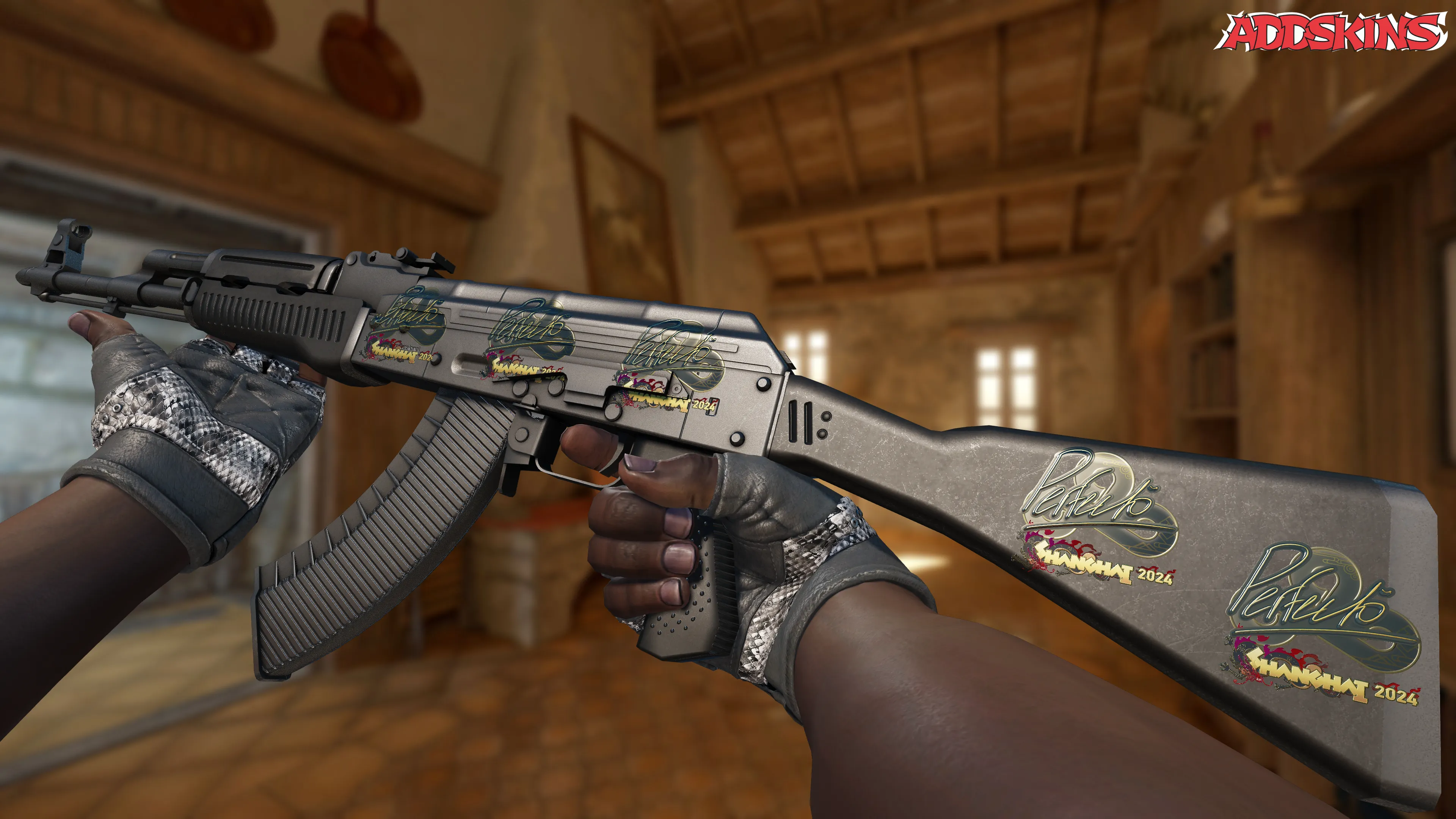Скин в стиле Perfecto (Gold) для CS2 отличается элегантным дизайном с золотыми оттенками и изысканными узорами, что делает его одним из самых привлекательных в коллекции. Версия скина для Shanghai 2024 имеет футуристический вид с яркими цветами и геометрическими узорами, подчеркивающими его уникальность и современность.